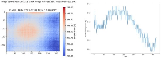 All wide-field imagery contains a certain amount of optical vignetting, which is manifested by the gradual dimming of light towards the edges of the image caused by optical components obstructing off-axis light []. The degree of vignetting in image data is very difficult to predict and usually corrections are made by experimental measurements. To observe the degree of vignetting a blackbody plate can be used, but this plate must have very little temperature variation across the plate and must also be large enough to fill the entire field of view. The plate must be large because the field of view must include off-axis radiation at large angles. The actual temperature of the plate is not required as the correction is a geometrical one. An isothermal wall might be a suitable target to measure vignetting. Figure 5 shows the vignetting pattern for the broadband channel when viewing a wall at a distance of 0.30 m. The wall is not completely uniform but the expected circular vignetting pattern is discernible. A transect across the image reveals that the brightness temperature variation amounts to ∼0.4 K and is small enough that a correction is not warranted.