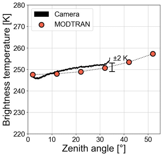 Uncooled microbolometer IR cameras with detection sensitivity between 8 and 14 m are optimised for use at temperatures between 270 and 370 K, which is higher than most cloud temperatures. The expected noise temperature in this range is between 0.1 and 0.2 K, but, at lower temperatures, this increases by a factor that depends on , where B is the Planck function, T is the (brightness) temperature and is the wavelength. At clear and cloudy sky temperatures of 240 K, the noise equivalent temperature difference (NEDT) is closer to ±0.5 K. These theoretical estimates need to be validated against real measurements. The camera calibration between 270 and 300 K was performed in the laboratory, and it was found that the camera is linear and accurate within this temperature range. Below 270 K, one way to assess the accuracy of the camera is to make clear sky measurements and compare these with radiative transfer calculations using a model driven by temperature and humidity profiles from a nearby radiosonde station. This has been performed on several occasions, and one example is shown in Figure 6 for a clear sky during the night. The radiosonde data were obtained from the University of Wyoming’s upper air sounding website (https://weather.uwyo.edu/upperair/sounding.html, (accessed on 14 March 2024)) for Perth airport ( station ID: 94610) on 29 November 2021. The camera was tilted at ∼60° elevation so that the field of view covered zenith angles from 2° to 32°. The MODTRAN [] code was used to calculate the broadband radiance between 7.8 and 14 m and converted to the brightness temperature at an equivalent wavelength ( ≈ 10.2 m) that gives the same radiance as that obtained by integration over the filter function. The results shown in Figure 6 compare the MODTRAN calculation with an average of 50 images, each averaged over 10 lines orthogonal to the angle of tilt around the centre of the image (keeping the camera fixed) and plotted against the zenith view angle of the camera. The results suggest that the camera agrees with the radiative transfer calculation within ±2 K for zenith angles less than 30 degrees. More data are required in order to investigate whether there is agreement at higher zenith angles with radiative transfer calculations, where the atmospheric path is much longer and the sky temperature is more difficult to calculate accurately. It is also necessary that the sky is clear: clouds, particularly thin cirrus, are difficult to model.
