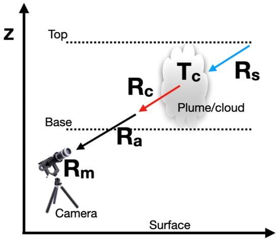 The extra measurement helps but does not alleviate the problem of estimating the cloud temperature as both and are not known. The path transmittance can be evaluated using a model and radiosonde data, and it is reasonable to assume this is the same over the whole image. However, will vary from pixel to pixel and cannot be evaluated through modelling. A possible option, then, is to find the warmest pixel ( = ) in the image of the cloud/plume and assume that this is optically thick and , . Then, a third measurement gives