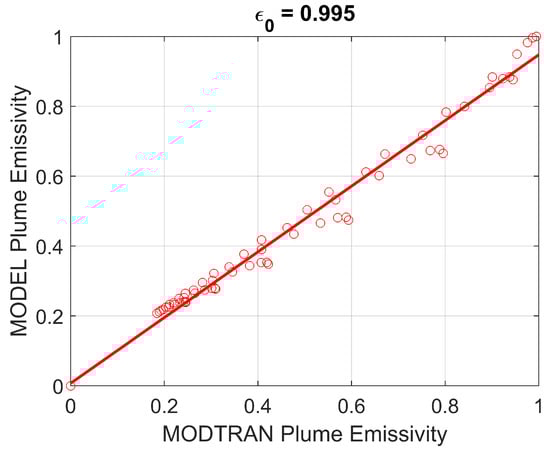 These equations are valid spectrally, and therefore, in theory, they are not valid for a broadband sensor, so it is worthwhile to check on the validity using simulations. This has been performed again using MODTRAN, and the results are shown in Figure 8, where the modelled emissivity from Equation (7) is plotted against the simulated (MODTRAN) emissivity for an ash cloud with a thickness of 0.5 km placed at 1.5 km above the surface of a uniform cloud temperature (293 K), variable optical depth and ash particle effective radii in the range of 0–10 m.