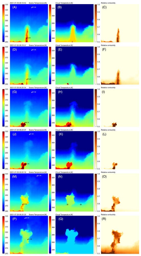 Brightness temperature or scene temperature, in panels (A), (D), (G), (J), (M) and (P), retrieved cloud temperature in panels (B), (E), (H), (K), (N) and (Q) and retrieved cloud emissivities in panels (C), (F), (I), (L), (O) and (R) for a sequence of images obtained during Stromboli activity on 25 July 2021. The black-coloured rectangles in panel (N) show locations inside and outside the plume where 5 × 5 means have been calculated to construct time series. (see Figure 10). Note that the images have been cropped to remove the hillside.