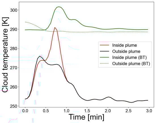 Cloud temperatures as a function of time inside and outside a volcanic plume emitted from Stromboli. The scene brightness temperatures (not corrected for emissivity) at the same locations are also shown (green-coloured lines). See Figure 9, panel (N) for the locations.