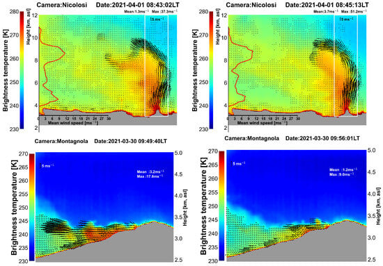 Optical flow analyses for eruptions at Mt. Etna volcano. (Upper-panels): 1 April 2021, 08:43–08:45 LT (LT = UTC + 2). (Lower-panels): 30 March 2021, 09:49–09:56 LT.