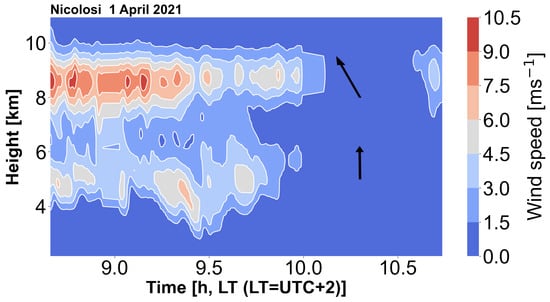 Figure 12 shows a contour plot of the smoothed time–height optical flow wind speeds for a period of about 2 h on the morning of 1 April 2021. This is the magnitude of the wind, but the directions at the two maxima were quite consistent. Their directions are indicated by the arrows shown on the plot. This suggests that the lower core is due mostly to the force of the eruption, while the upper core is dominated by the prevailing meteorological winds at that level. In other words, the resulting column is ‘bent over’. Visual analysis confirms this conclusion (Figure 13). Analysis of the meteorological wind fields at this time and location (https://earth.nullschool.net/#2021/03/31/2300Z/wind/isobaric/250hPa/orthographic=-346.38,38.65,1706/loc=15.189,37.614, (accessed on 14 March 2024)) suggests ∼20 ms−1 speeds from the NE at ∼10 km, weakening substantially to ∼3 ms−1 from NNW at ∼19 km.
