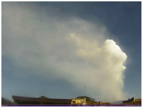 - Scollo, S.; Prestifilippo, M.; Mereu, L. Estimations of eruption column height during Etna eruptions: A new database based on visible calibrated cameras. In Proceedings of the EGU General Assembly Conference Abstracts, Vienna, Austria, 23–28 April 2023; p. EGU–13071. [Google Scholar]