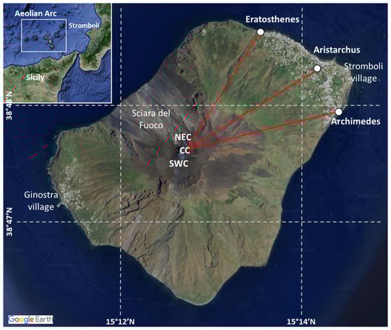 Stromboli Island and its position on the Tyrrhenian Sea, with locations of villages, Sciara del Fuoco, main craters (NEC: North East Crater; CC: Central Crater; and SWC: South West Crater) and the position of the three IIRc systems (Eratosthenes, Aristarchus and Archimedes). Modified from Di Traglia et al. [].