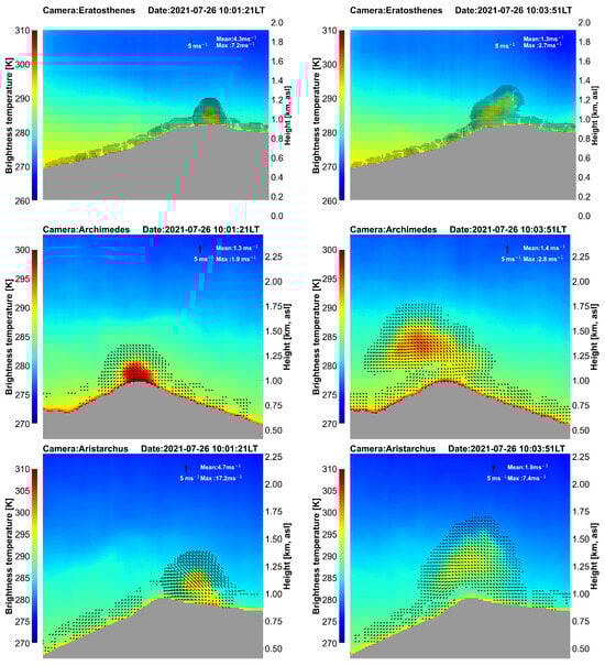 The main purpose was to obtain data for tomographic analysis while also comparing measurements using different cameras and obtaining ascent rates. Stromboli undergoes frequent, small (column heights <1 km) eruptions [] and has been studied previously using thermal cameras [], so it is an ideal target for testing the cameras. Data were acquired from all three cameras at the maximum sampling rate of 1 Hz. Figure 15 shows an example of the optical flow obtained from the cameras at two different times, separated by 2.5 min, illustrating the development of the eruption column. In these examples, the means have been calculated for all wind vectors with speeds >0.5 ms−1. At 10:01:21 LT (left-hand panels of Figure 15), there is a disparity between the estimates from the three cameras, whereas at 10:03:51 LT (right-hand panels of Figure 15), the agreement is good. The reasons for disagreement may be due to wind direction, which is not accounted for in the calculations. In future work, the wind direction will be taken into account to obtain an approximate three-dimensional reconstruction of the plume behaviour. Even so, with three cameras all placed in one quadrant, it will not be possible to obtain an accurate estimate of the wind field, and the optimal number of cameras to utilise requires further field studies.