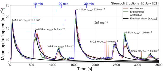 The three cameras capture the eruptions in a consistent manner, with maximum heights () of ∼1 km and maximum ascent rates (updraft velocities, ) of ∼20 ms−1. The two sharp peaks between 2300 and 2500 s and the one near 3100 s measured by Archimedes (red-coloured line in Figure 16) are anomalies caused by failures in the optical flow algorithm. They can be removed using data filtering methods, but this did not seem necessary since they are not detected by the other two cameras and, hence, can be inferred to be to algorithmic failure. Given estimates of and , the model is a good indicator of the decay rate of the column. Such measurements are useful in the context of hazard assessment as they provide an estimate of the lifetime of each event, in this case, ∼10 min. It is difficult to judge whether this timescale has any effect on the frequency of eruptions or whether the maximum height of subsequent eruptions is influenced by the height reached by an event immediately before, but these data, in conjunction with other data such as seismicity, might be useful for investigating this further. Longer series of measurements are required for such studies, and this would require the deployment of an IR camera permanently or semi-permanently at the volcano.
