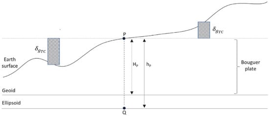 In geodesy, Bouguer anomalies are important to use for gridding process and data interpolation purpose [,]. These anomalies are also necessary because many geoid modeling algorithms evaluate the gravity data in grid form. Additionally, Bouguer anomalies are also used to explain geological structures in geophysics disciplines []. In Bouguer reduction, the topography is represented as plate (or shell), and the gravitation of all the masses within this plate above the geoid are calculated and removed from the observed gravity. Here, the thickness of the Bouguer plate is , and it is equal to the height of topographic point P [,]. An illustration of a Bouguer plate is given in Figure 1 below [,]: