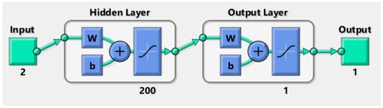 The algorithm runs with the “nnstart” command on MATLAB, and “nntool” is not available for versions later than R2022a []. There are various ANN techniques built into the MATLAB software such as radial basis, generalized regression, NARX, hopfield, feed-forward backpropagation, Elman backpropagation, etc. [,,]. Here, the feed-forward backpropagation technique is used with the “trainlm” function, which specifies the Levenberg–Marquardt approach. Additionally, the “tansig” transfer function and “learngdm” adaption learning function with 2 layers and 200 neurons are chosen to specialize the method (see Figure 2). In contrast to the Levenberg–Marquardt approach, which is fast but requires a high memory capacity, there are also two other common methods named Bayesian regularization (trainbr) and scaled conjugate gradient (trainscg). See Demuth et al. [] for further information.
