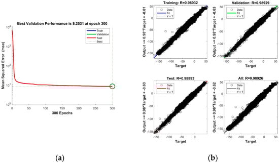 Neural network training performance (a) and regression (b).