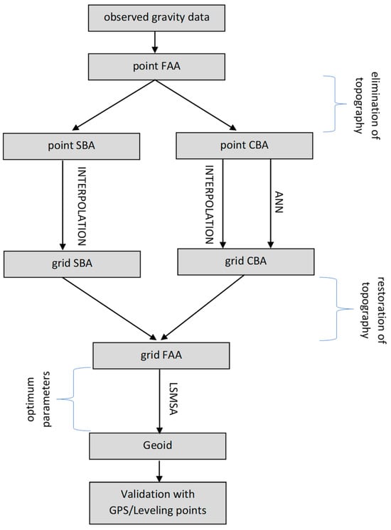 The need for reductions in gravity anomalies to the geoid stems from the requirement of regular grid usage of geoid computation algorithms such as the LSMSA method. Therefore, pointwise gravity anomalies on the Earth’s surface are transformed into simple or complete (refined) Bouguer anomalies that have smooth characteristics for interpolation processes [,]. Although the interpolation process directly affects the accuracy of the geoid computation, the choice of the optimum interpolation techniques plays an important role [,].