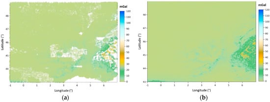 Figure 9a,b show the free air anomalies in the grids calculated from the SBA map (in Figure 7a) and CBA map (in Figure 7b), respectively. In Figure 10, a difference map of these two free air anomaly grids is given. The descriptive statistics of these grid free air anomaly datasets and their differences are given in Table 4. The table shows that the difference between two free air anomaly grids is 37.167 mGal and −86.721 mGal extremums. Figure 10 shows the locations where these extreme differences occur between the two grid datasets.