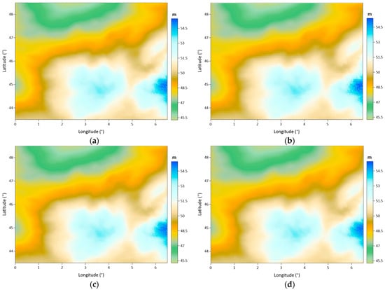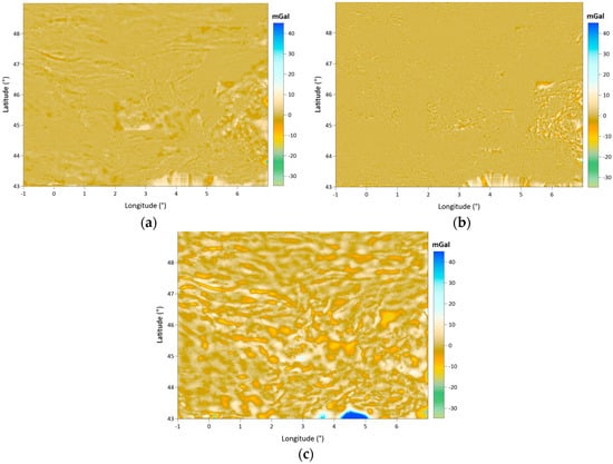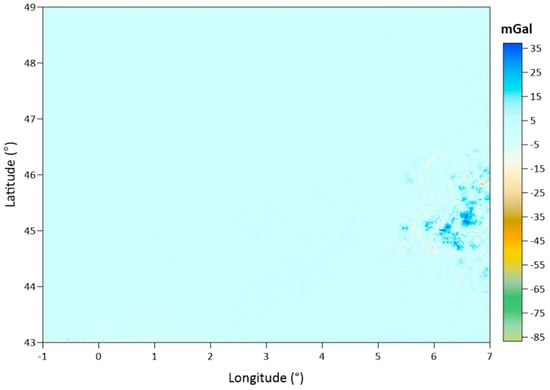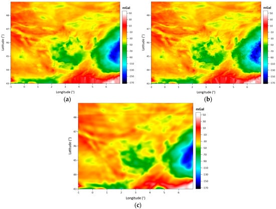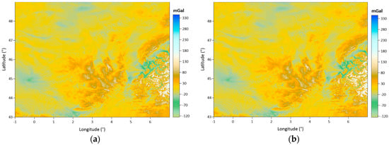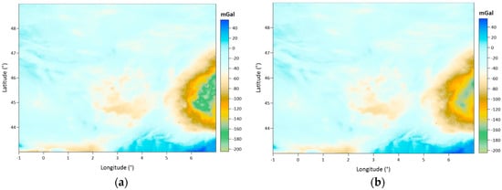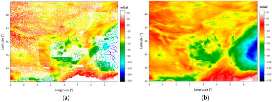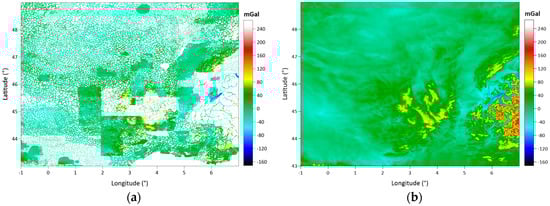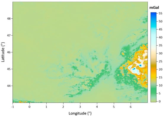 The Auvergne test region covers a 6° × 8° area. The dense and high-accuracy gravity observations measured in Auvergne are shared as the test dataset for gravity field modeling studies by the Institut Geographique National (IGN) in Bureau Gravimetrique International (BGI) database. These data are freely available to researchers in order to test geoid computation techniques. In the dataset, there are 244,009 gravity points within the coordinates in latitudes of 43° N–49° N and longitudes of 1° W–7° E. The approximate spatial density of the gravity observations corresponds to 1 point in every 1.3 km. This approximate distance between the gravity observations in the area is considered when determining the grid spatial resolution during the data gridding process. The accuracy of the gravity data is reported as ~2 mGal [].