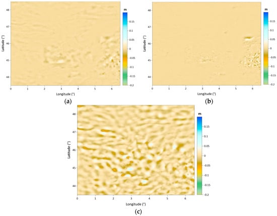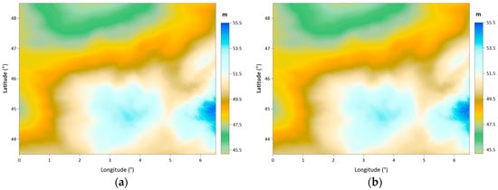 Thereafter, two different gravimetric geoid models are computed using these free air anomaly grids. In the geoid model computations using the LSMSA method, the adopted computation parameters are as follows: the spherical harmonic expansion degree of the geopotential model is M = 780, the error variance value is = 4 mGal2, the type of modification is used as = biased, and the radius of integration is = 0.25°. In the following text, a section (Section 3.3) explaining the selection process of the optimum parameters for the LSMSA geoid model computation method is given. Figure 11a,b shows the geoid maps, which are calculated using the free air anomalies derived from the SBA’s grid and CBA’s grid, respectively. The geoid models are calculated in 1 arc-minute spacing grid form. In Figure 12, the map shows the differences between these two geoid models. As seen from the difference maps given in Figure 10 and Figure 12, the geoid height differences exhibit a similar distribution pattern to the free air anomaly differences, and the differences increase with topographical heights. Table 5 gives the statistics of the calculated geoid models as well as the statistics of their differences. In the first two lines of the table, the statistics of the two models seem to be similar, having the same mean and standard deviation. Although in this view, the difference statistics show that the two models actually differ from each other with −19.5 cm and 27.3 cm minimum and maximum values, respectively.