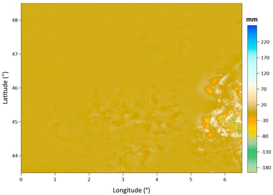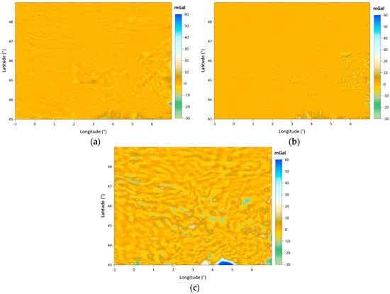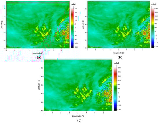 The difference map of the SBA and CBA values is also given in Figure 8, corresponding to the terrain corrections between the CBA and SBA values as given in Equation (6). The surface pattern of the difference map is naturally similar to the given terrain correction maps in Figure 6.