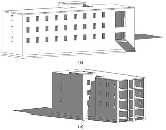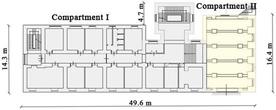 The DRPC building is rectangular in plan (Figure 2) and composed of four floors: an underground floor (at a depth of 1.60 m), a raised floor (at a height of 1.55 m), a first floor (at a height of 5.50 m) and a second floor (at a height of 9.50 m). In plan, two main compartments can be identified: one made up of perimeter and spine masonry walls (Compartment I) and the other made up of masonry columns with reinforced concrete beams and perimeter masonry walls (Compartment II). The foundation is composed of concrete beams for Compartment I and plinths for Compartment II, embedded to a depth of 2.9 m. A 3D view and axonometric cross section of the building are shown in Figure 3.