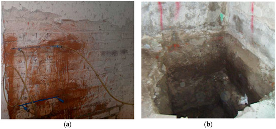 (a) Double flat jack test performed on the masonry walls; (b) foundation inspection pit.