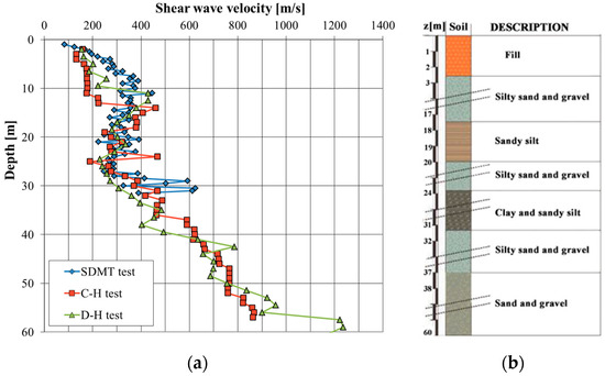 (a) Shear wave velocity, VS, profiles derived from the down-hole test (S3 borehole), cross-hole test (S1 and S2 boreholes) and Seismic Dilatometer Marchetti test (SMDT); (b) soil stratigraphy obtained from the S3 borehole.