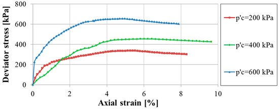 Figure 6 presents the deviator stress–axial strain curves obtained from CUTxT performed on sample S3C4 (sample C4 retrieved from 27.00–27.50 m in borehole S3) under different values of p′c (200 kPa, 400 kPa and 600 kPa) for a back pressure of 190 kPa.