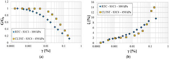 Values of the normalized shear modulus G/G0 and damping ratio ξ [%] versus γ [%] for samples S1C1 (sample C1 retrieved from 7.00–7.50 m in borehole S1) and S3C4 (sample C4 retrieved from 27.00–27.50 m in borehole S3) obtained by RTC and CLTST, respectively, are reported in Figure 7.