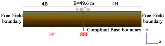 Relevant previous studies [7,22] showed the important role of boundary conditions in numerical modeling. In this regard, default fixities were applied to generate the initial stresses due to gravity loading, and free-field and compliant base boundary conditions [23,24] were considered for the dynamic phase (Figure 9).