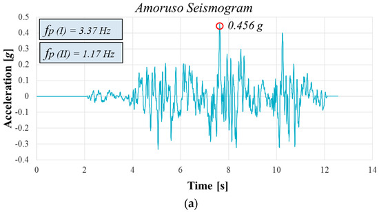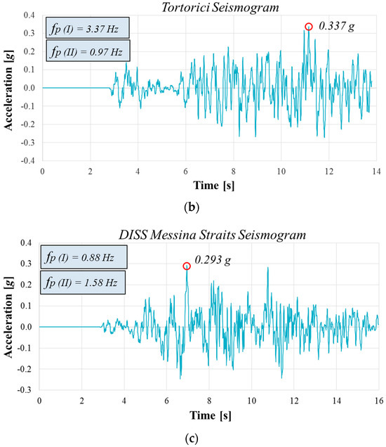 A single planar fault was employed to derive the first source model [32]. Normal faulting with an ESE–WNW extension, as the dominant mode of deformation of the Calabrian arc, was considered to obtain the second source model [33]. The third source model, included in the Italian Database of Individual Seismogenic Sources (DISS) by Basili et al. [34], is a low-angle normal fault obtained by Valensise and Pantosti [35]. The three synthetic seismograms (Figure 11) have a peak ground acceleration (PGA) of 0.456 g, 0.337 g and 0.293 g, respectively, corresponding to different return periods in the Italian technical standard of construction NTC [4]: 1950 years, 950 years and 712 years.
