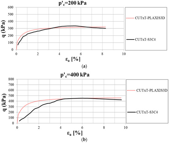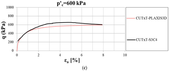 In order to determine the stiffness and strength parameters of the HS small model, CUTxT were simulated using PLAXIS3D software. In Figure 12, the comparison between the calibrated model for the sandy silt and clay layer, as an example, and the results derived by CUTxT for sample S3C4 under different values of p′c (200 kPa, 400 kPa, 600 kPa) for a back pressure of 190 kPa is reported.