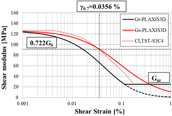 Comparison between the calibrated model and the results of the CLTST performed on sample S3C4. The dashed-line portion of the black curve indicates the value of the unloading–reloading stiffness, Gur, that limits the tangent shear modulus, Gt. Intersecting dotted black lines indicate the shear strain level, γ0.7, at which the secant shear modulus, GS, is reduced to 72.2% of G0.