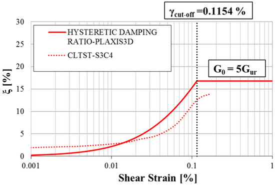 In Figure 14, the hysteretic damping in the HS small model is compared with the increase in damping as a function of the level of deformation obtained from the CLTST performed on sample S3C4.