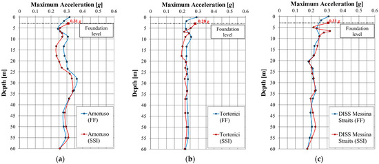 Maximum accelerations with depth along SSI and FF alignments using: (a) Amoruso, (b) Tortorici and (c) DISS Messina Straits seismograms.