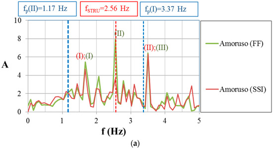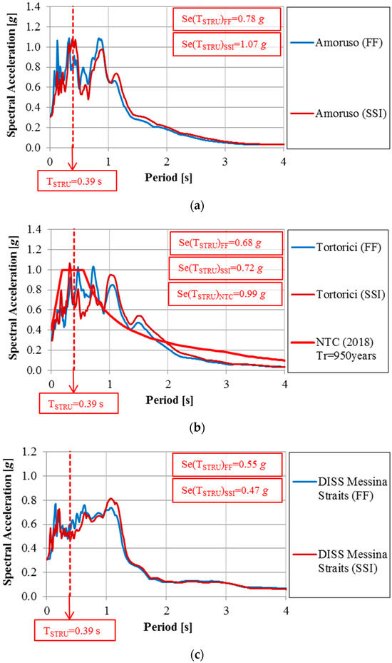 Figure 16 reports the results at the surface in terms of spectral accelerations obtained by setting a structural damping of 5%. Considering the Amoruso seismogram, for the period of the structure (TSTRU = 0.39 s from modal analysis), a spectral acceleration of 1.07 g was obtained for the SSI alignment, while a lower value of 0.78 g was found for the FF condition (Figure 16a). Thus, in this case, the SSI leads to a designed acceleration greater than that required in the FF condition.