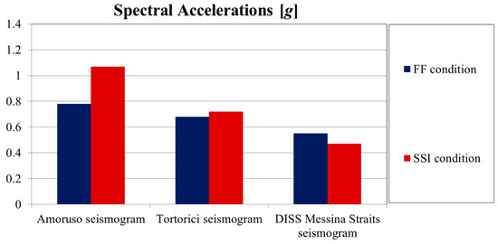 The results obtained adopting the DISS Messina Straits seismogram (Figure 16c) show a spectral acceleration Se(TSTRU)FF = 0.55 g for the FF condition and Se(TSTRU)SSI = 0.47 g for the SSI condition. Therefore, in this case, the SSI has a beneficial effect. Figure 17 summarizes the values of spectral acceleration for the period of the structure using as input the three 1908 seismograms.