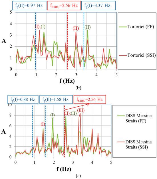 Amplification functions, A(f), for FF and SSI conditions using: (a) Amoruso, (b) Tortorici and (c) DISS Messina Straits seismograms.