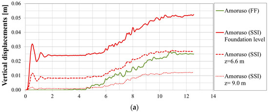 It can be observed that instantaneous settlements of about 0.025 m occur at the beginning of the dynamic time at the foundation level considering the SSI condition, while they are zero at the ground surface in the FF condition. Values tend to increase in correspondence with the acceleration peaks of each seismogram. At the end of the dynamic time, settlements of 0.052 m, 0.049 m and 0.043 m occur for the Amoruso (Figure 20a), Tortorici (Figure 20b) and DISS Messina Straits (Figure 20c) seismograms, considering the SSI condition. On the other hand, they are reduced to 0.025 m, 0.037 m and 0.015 m for the Amoruso (Figure 20a), Tortorici (Figure 20b) and DISS Messina Straits (Figure 20c) seismograms at the FF soil surface.
