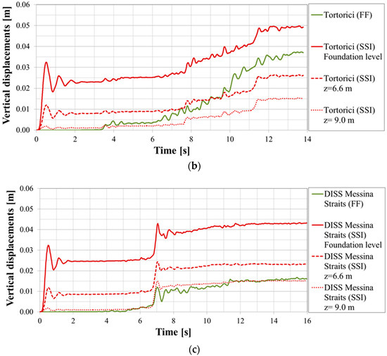 Comparison between the vertical displacements for the FF and SSI conditions using: (a) Amoruso, (b) Tortorici and (c) DISS Messina Straits seismograms.