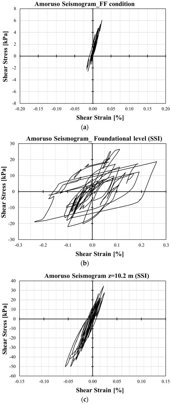 Stress–strain hysteretic loops obtained using the Amoruso seismogram: (a) for the FF condition; (b) for the SSI condition at the foundation level and (c) at a depth of 10.2 m.