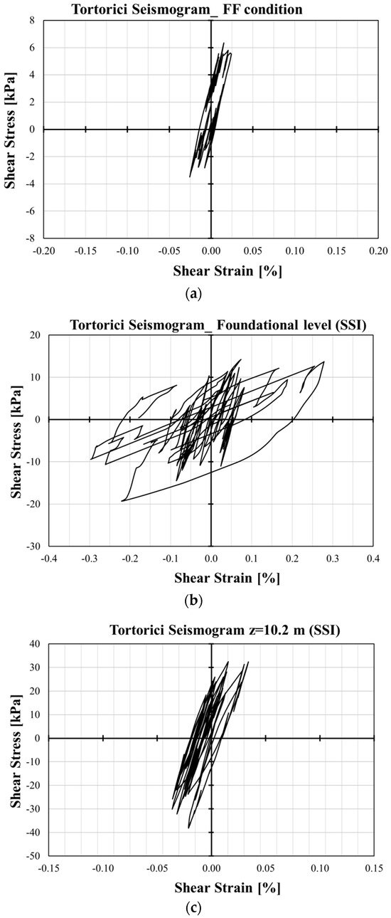Stress–strain hysteretic loops obtained using the Tortorici seismogram: (a) for the FF condition; (b) for the SSI condition at the foundation level and (c) at a depth of 10.2 m.