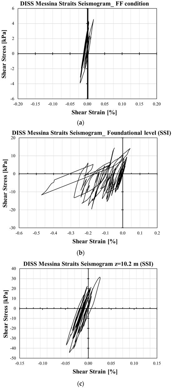 Stress–strain hysteretic loops obtained using the DISS Messina Straits seismogram: (a) for the FF condition; (b) for the SSI condition at the foundation level and (c) at a depth of 10.2 m.