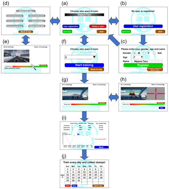 Operation flow of the “Tsunami Evacuation Training Application”: (a) menu screen, (b) user registration screen, (c) user attribute screen, (d) tutorial image selection screen, (e) tutorial image screen, (f) training image selection screen, (g) training screen, (h) training screen with an overhead view, (i) result screen, (j) stamp screen.