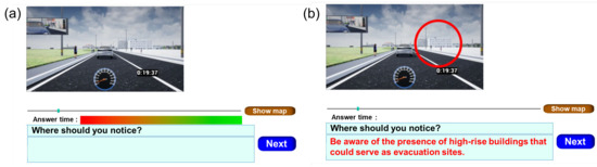 Considering these findings, the “Tsunami Evacuation Training Application” was designed to mainly include questions that direct attention to “traffic signals”, “tall or large buildings”, “pedestrians attempting to cross the crosswalk”, and “vehicles not noticing pedestrians attempting to cross the crosswalk”.