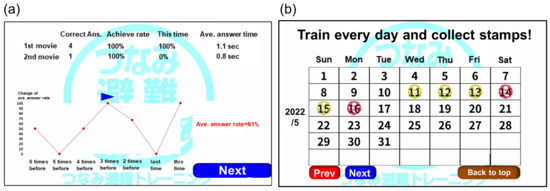 The result and stamp-rally screen. (a) The result screen. The upper area shows the correct number, achievement rate of the questionnaire, overall correct rate, and average correct rate of each movie. The lower area shows the time-series graph of the average correct rate. (b) The stamp rally screen. The red cherry blossom stamp marks the completion of all the training in one video, and the gold cherry blossom stamp marks the completion of all the training in the eight videos.