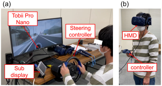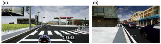 The simulator was based on the driving simulator software Sirius, developed by Misaki Design LLC [29] using the Unreal Engine 4. The traffic environment was reproduced using the open-source multi-agent traffic flow simulation program Re:sim, developed by Misaki Design LLC, which controlled traffic and human flow in the simulator [29]. Therefore, the tsunami evacuation training simulator simulated a mixture of evacuees on foot and by car. Note that this simulator could not simulate an evacuation on foot or by car simultaneously. In other words, the simulator could simulate either an evacuation on foot or an evacuation by car in a situation in which the two types of evacuees were mixed. In the case of an automobile evacuation, a steering controller connected to a PC was operated. In this case, the driver operated the steering controller connected to the PC and watched the screen on the display connected to the PC. However, in the case of an evacuation on foot, an HMD (Vive Pro Eye, HTC Corporation) was used, and the button on the attached controller was pressed to make the user walk in the direction in which their head was facing at that time. In addition, a sub-display was set to the left side of the user to show the map while evacuating by car. The operating scene of the simulator is shown in Figure 4. Figure 4a shows the tsunami evacuation training simulator assuming an evacuation by car, and Figure 4b shows that assuming an evacuation on foot. The simulation screens for the actual evacuations by car and foot are shown in Figure 5a and Figure 5b, respectively.