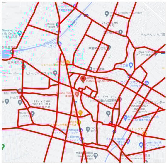 In particular, a 3 km × 3 km area centered on the Aichi Prefectural Isshiki High School was implemented. Considering the processing speed and load on the computer, not all roads and buildings could be reproduced in the tsunami evacuation training simulator. Therefore, only the red roads and buildings or houses along these roads were reproduced (Figure 6). This area is where national and city roads intersect and was deemed appropriate for reproducing a situation in which pedestrians and automobiles intersect. Several types of evacuees on foot (children, elderly, wheelchair evacuees, etc.) were evacuated at speeds based on the results of the Aichi Prefecture tsunami evacuation simulation [32]; thus, the simulation reproduced the actual tsunami evacuation almost exactly.