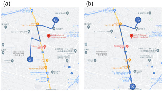 The routes used for the experiment in Nishio City. The map is centered on Aichi Prefectural Issiki High School. In each route, Ⓢ indicates the starting point and Ⓖ the destination. (a) Route 1, (b) Route 2. (Google Map data ®2023 ) [33].