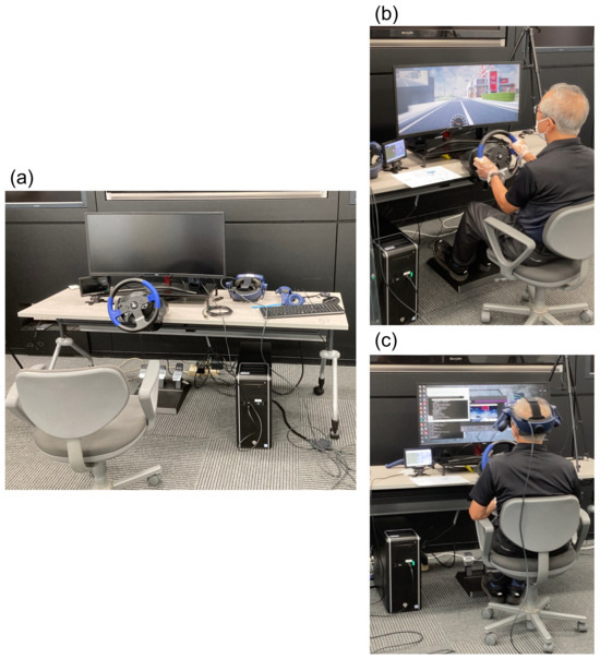 The experimental setup is shown in Figure 8. Figure 8a shows the setting of the tsunami evacuation training simulator, Figure 8b the experiment of an evacuation by vehicle, and Figure 8c the experiment of an evacuation on foot. In Figure 8c, elderly participants performed the VR experiment while seated in a chair for fear they might lose their balance and fall during the VR experiment. The experimental flow was as follows: