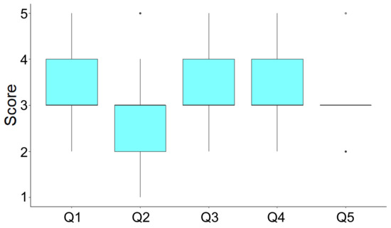 First, we discuss the usability of the “Tsunami Evacuation Training Application”. As shown in Figure 9, the operability and visibility were approximately average, and neither good nor bad. However, considering the range of the box–whisker plot, there was room for improvement of its visibility. To confirm whether the slightly lower ratings for visibility were due to the devices used by the participants, that is, the difference between a smartphone with a smaller screen size and a tablet with a larger screen size, we discuss Figure 10, which showed no significant difference between smartphones and tablets for all questions, suggesting that the low visibility may be due to the design of the “Tsunami Evacuation Training Application” rather than the differences in the devices. In contrast, for Q3, while there was no significant difference between smartphones and tablets, tablets tended to be scored higher than smartphones, suggesting that many participants found tablets easier to read than smartphones in terms of font size. As for Q1, the operability of the “Tsunami Evacuation Training Application” was the same. All participants tapped on what they thought was the correct answer, and the smaller the screen size, the harder it was to tap correctly. Therefore, tablets tended to be more operable than smartphones. This is supported by the results shown in Figure 12. Indeed, many participants commented that the screen was too small to tap correctly or find objects and/or buildings. This trend was more pronounced for smartphones than tablets. Besides the device issue, Figure 12 showed that the “Tsunami Evacuation Training Application” design was also problematic. For example, we received many comments that the diameter of the circle that determined the correct answer was small, which made it difficult to tap. This indicates that improvements must be made to the design of the interface.