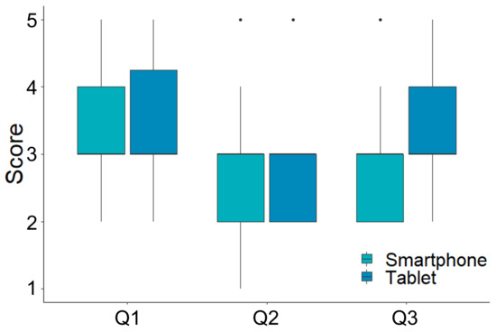 The box–whisker plot comparing the differences in the devices (smartphone and tablet) for Q1, Q2, and Q3.
