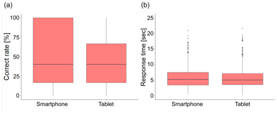 Next, we considered whether the correct rate and response time were due to the device. Figure 11a indicated that the third quartile of correct rate on smartphones was larger than that on tablets, and Figure 11b for the response time showed that the tendency on smartphones was the same as that on tablets. Considering these, the quickness and accuracy of answering was not different when using a smartphone or a tablet, but the third quartile of the correct rate on smartphones suggested that smartphone users may have been influenced by familiarity or unfamiliarity with the small screen size.