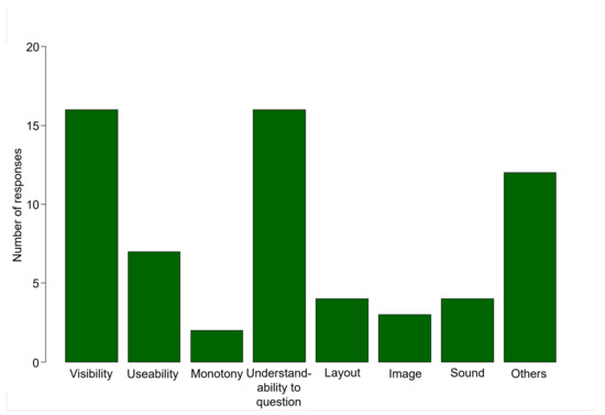 The results of what the participants noticed when using the “Tsunami Evacuation Training Application” (Q6) are also shown in Figure 12. It should be added that all the participants wrote down suggested points of improvement or dissatisfaction, not their points of concern. Thus, note that the labels in Figure 12 are the items of dissatisfaction and improvement, and the numbers in Figure 12 are the number of stated responses to each item.